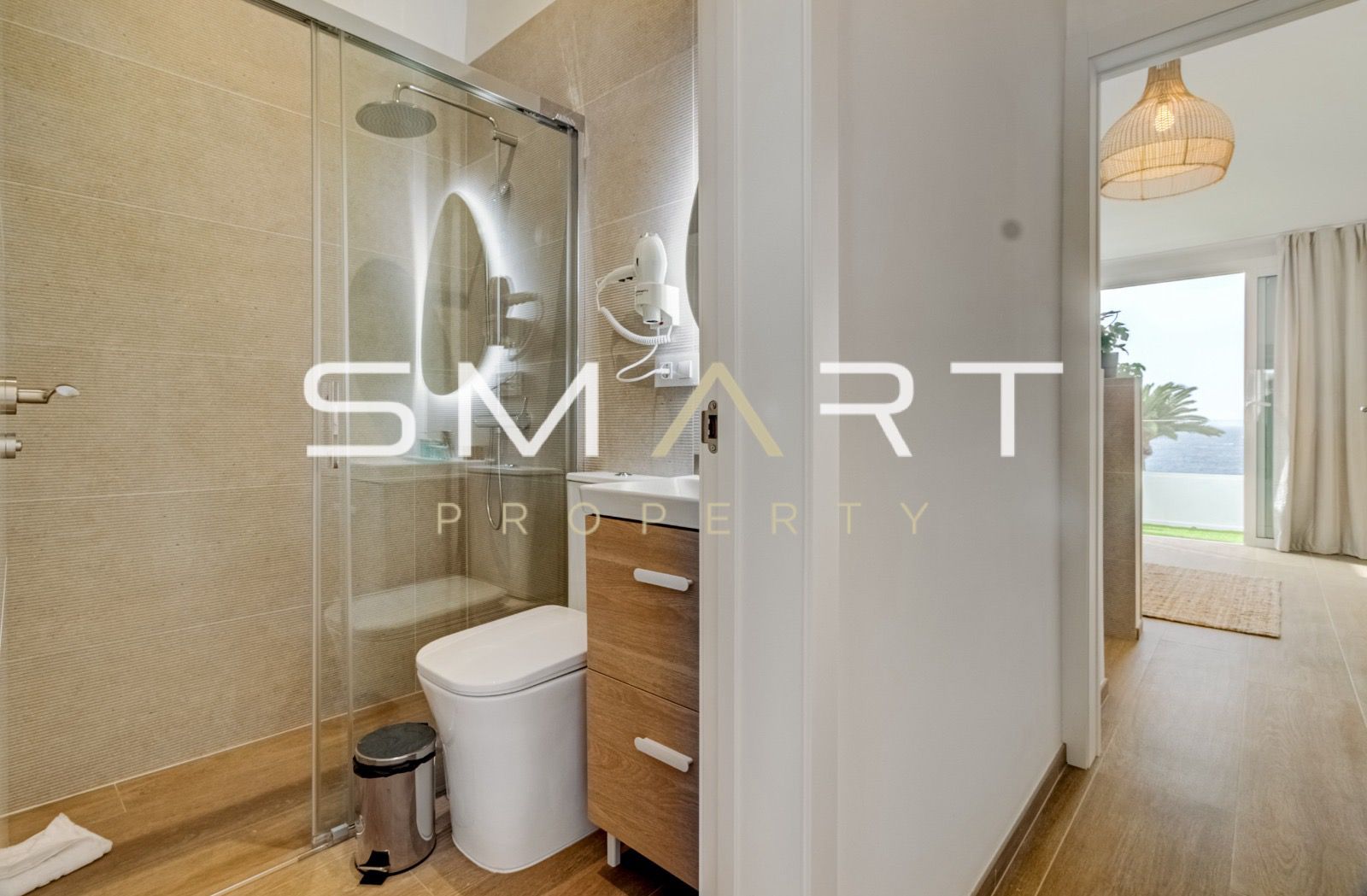 Le logement présente un design contemporain, est lumineux et offre une vue sur la mer. Au rez-de-chaussée se trouvent la cuisine entièrement équipée et un spacieux salon-salle à manger. À l’étage supérieur, il dispose de deux chambres, dont une suite parentale avec salle de bains privée et accès direct à une terrasse avec une vue imprenable sur la mer, ainsi qu’une seconde salle de bains complète.