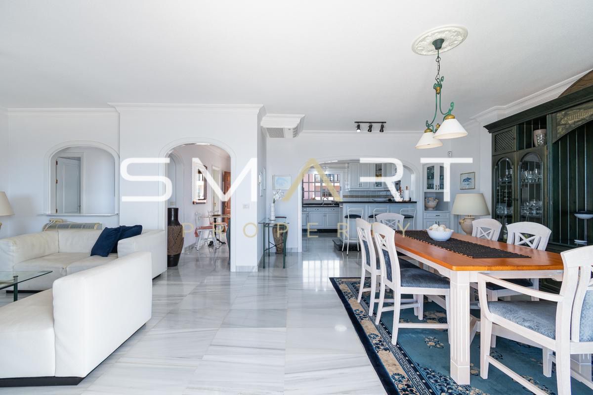 L’un des principaux atouts de ce penthouse est sa spectaculaire terrasse principale d’environ 58 m², orientée plein sud, accessible directement depuis les chambres, le salon et le bureau grâce à de grandes baies vitrées coulissantes. Depuis cette terrasse, vous profitez d’une vue panoramique à 180 degrés sur la mer, avec l’île de La Gomera à l’horizon.